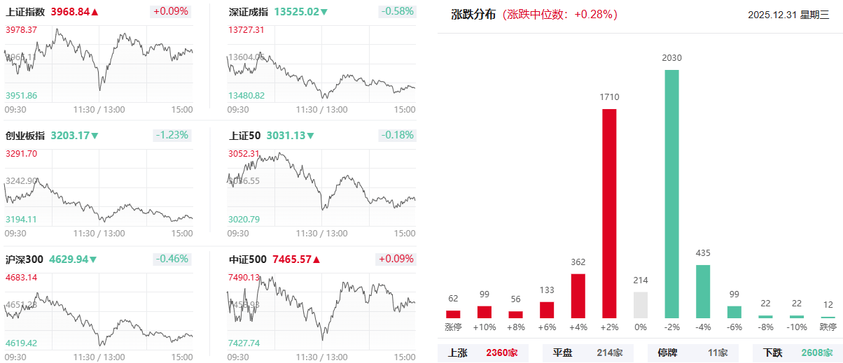 整体来看,算力硬件、有色金属、银行、电池产业链、创新药、商业航天、机器人等多个热门板块轮动。沪深两市12月31日成交额2.05万亿,较上一个交易日缩量974亿。
