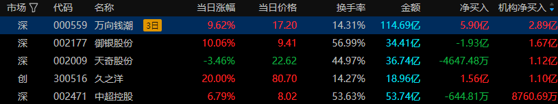 ②万向钱潮(000559),资金净额买入5.90亿元,所属板块:汽车零部件。上榜原因:连续三个交易日内,涨幅偏离值累计达20%的证券。