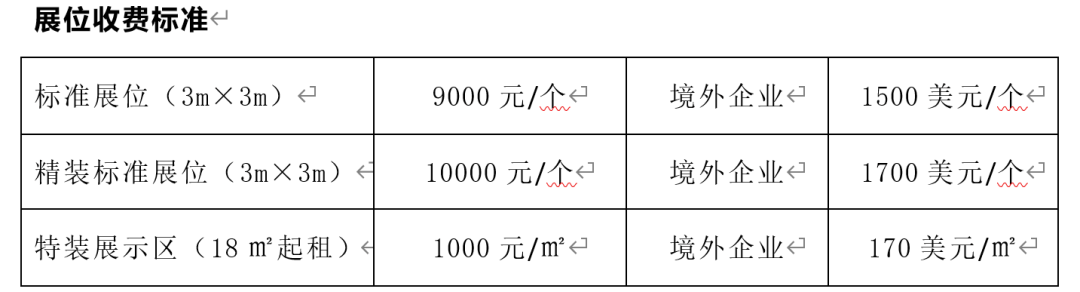 2. 精标展位基本配置:3m×3m展位(包括精装标准展台、布幅广告门楣、地毯、一桌两椅、门楣射灯、展位射灯、220V电源插座);