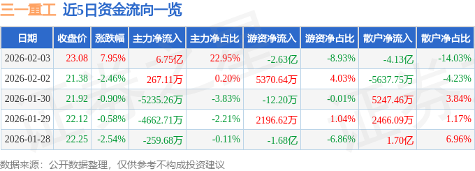 2月3日的资金流向数据方面,主力资金净流入6.75亿元,占总成交额22.95%,游资资金净流出2.63亿元,占总成交额8.93%,散户资金净流出4.13亿元,占总成交额14.03%。