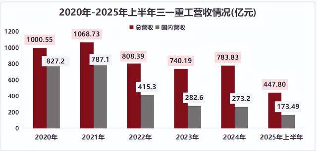从数据来看,三一重工的国内营收已从2020年的827.2亿元一路下滑至2024年的273.2亿元,降幅达到66.97%。