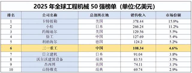 2025年全球工程机械50强榜单中,三一重工的市占率为4.6%,排名全球第六。头部企业依旧是市占率15.9%的卡特彼勒和11.2%的小松。